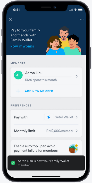 Upon activation, owners can directly add existing Setel users as members to their Family Wallet.