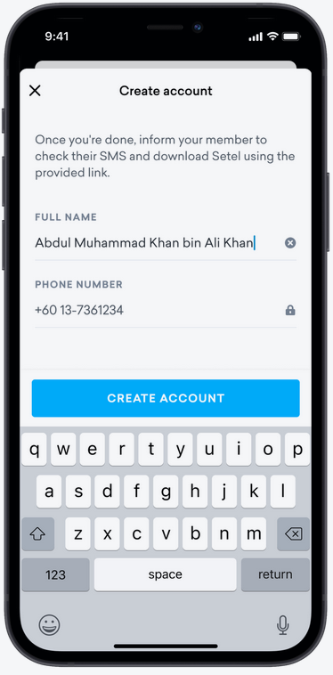 The member’s name and phone number will be auto-populated. The owner just needs to tap on Create account.