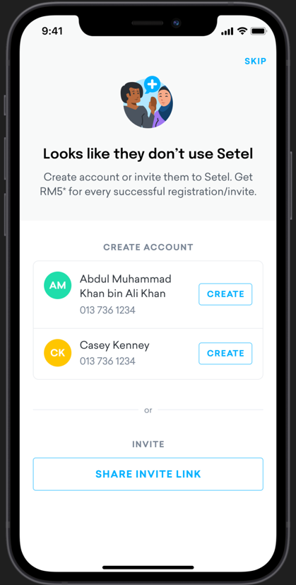 For non-Setel users, the owner can help them create an account. Just tap on Create next to the member's name.