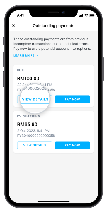 A list of outstanding payments will appear. You can tap View details to see the receipt of that transaction.